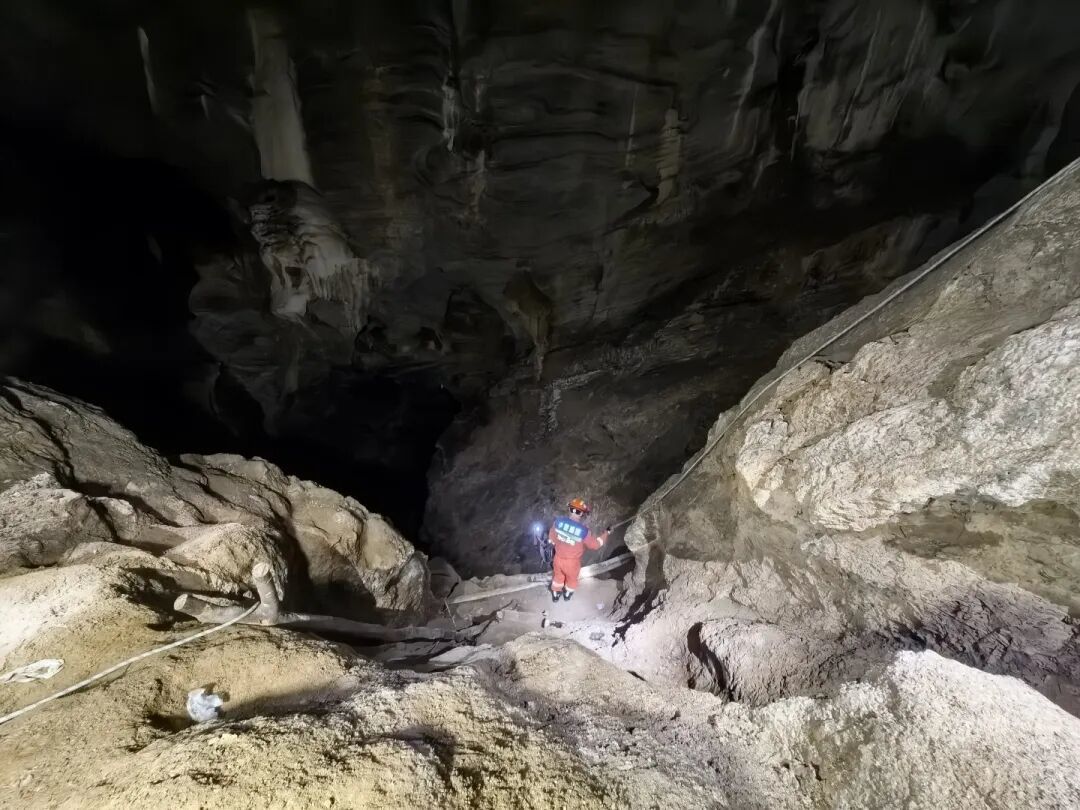 救援队伍抵达现场勘察发现,该山洞为未开发区域,内部光线极度昏暗,地形错综复杂,沟深壁陡且洞底垂直落差明显,无现成路径可抵达被困人员位置,救援难度较大。关键时刻,救援人员了解到两名被困者具备绳索攀升技能,指挥员随即快速研判、果断制定“自主攀登与辅助提拉相结合”的救援方案,组织队员快速搭建起安全绳索救援通道。
