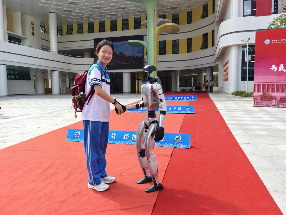 武汉市光谷汤逊湖学校新校区,人形机器人迎接新生到校