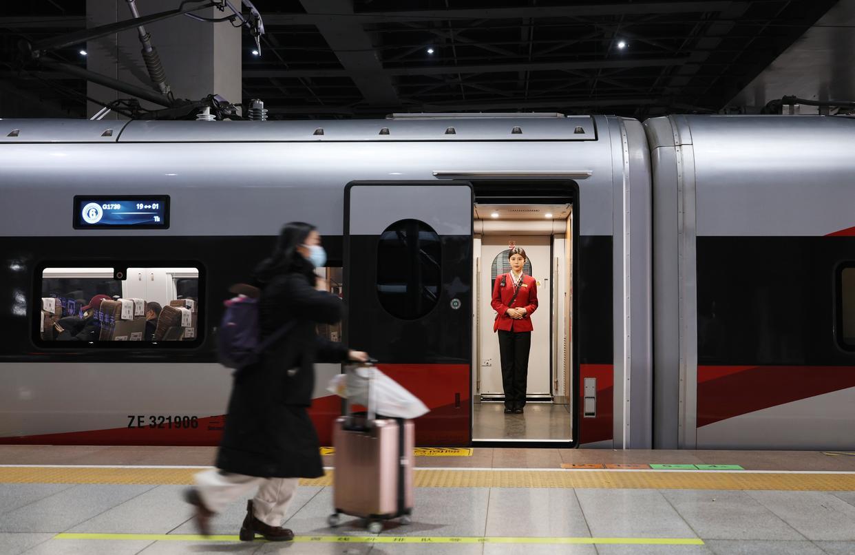 1月26日,天津客运段的乘务人员在车厢内立岗。新华社记者 李然 摄