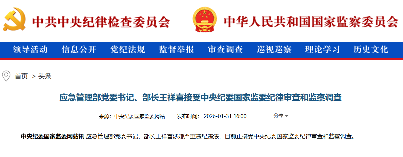 随着王祥喜此番落马,2026年以来中央纪委国家监委网站公开通报审查调查的中管干部已达8人。