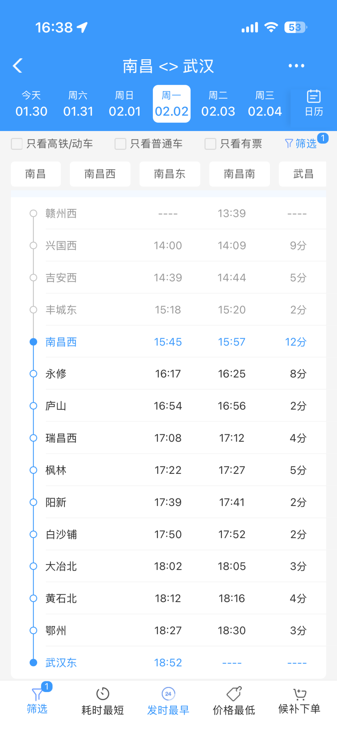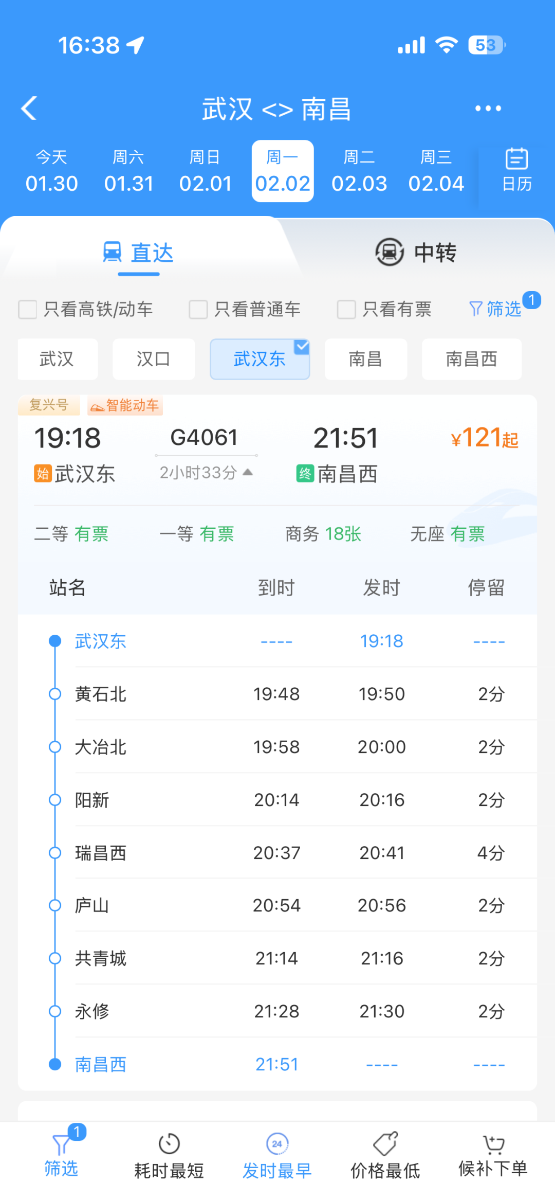 2月2日起,武汉东站新增两趟跨省高铁列车,分别为武汉东直达南昌西的G4061次,以及赣州西直达武汉东的G4062次。其中,G4061次列车19:18从武汉东站发车,经停黄石北、瑞昌西、庐山等8个站点,21:51抵达南昌西站,全程仅2小时33分钟,实现两地高效联通;G4062次列车13:39从赣州西站发车,经停南昌西、庐山、阳新等14个站点,18:52抵达武汉东站,满足沿线多地旅客快节奏出行需求。