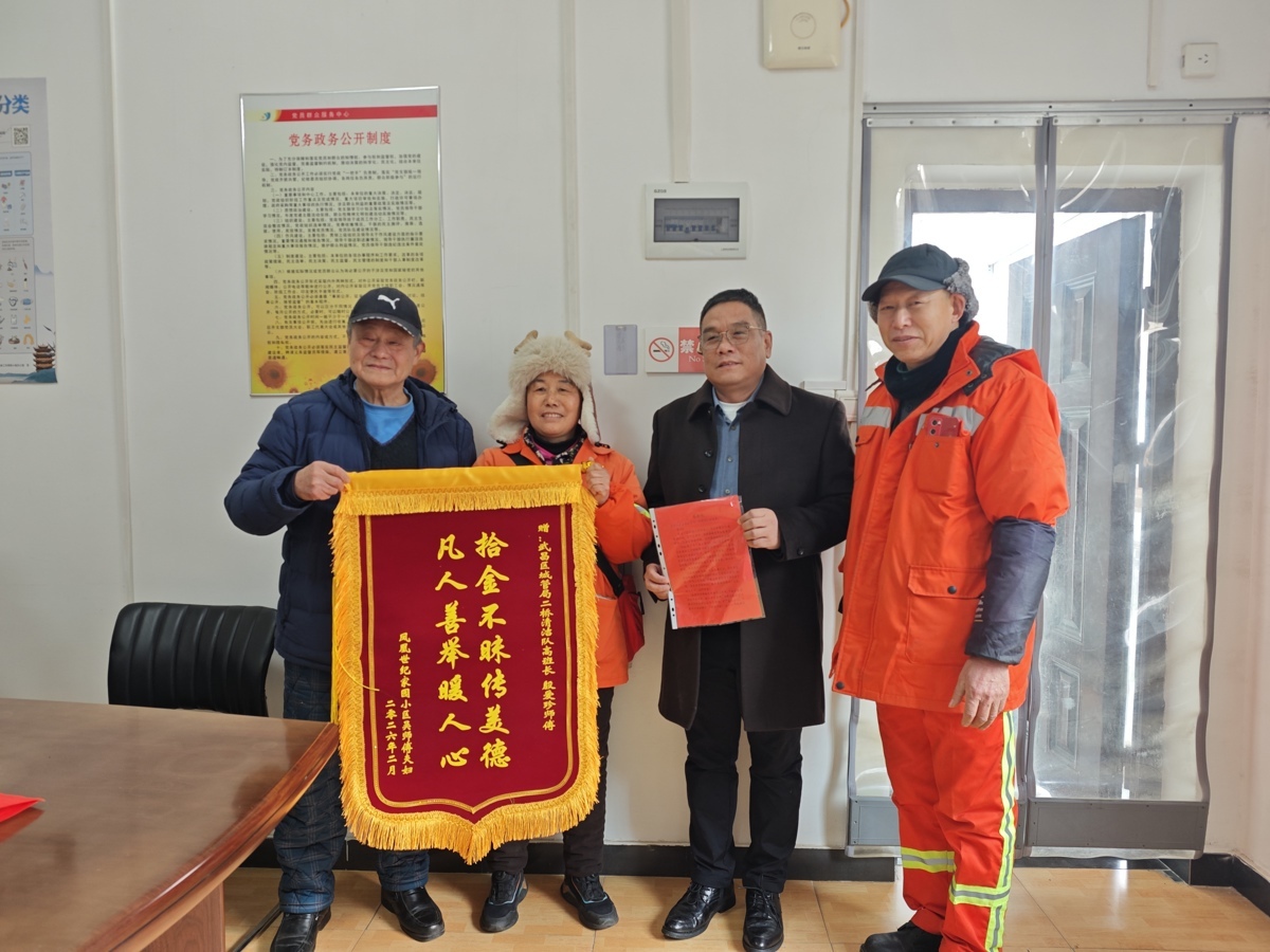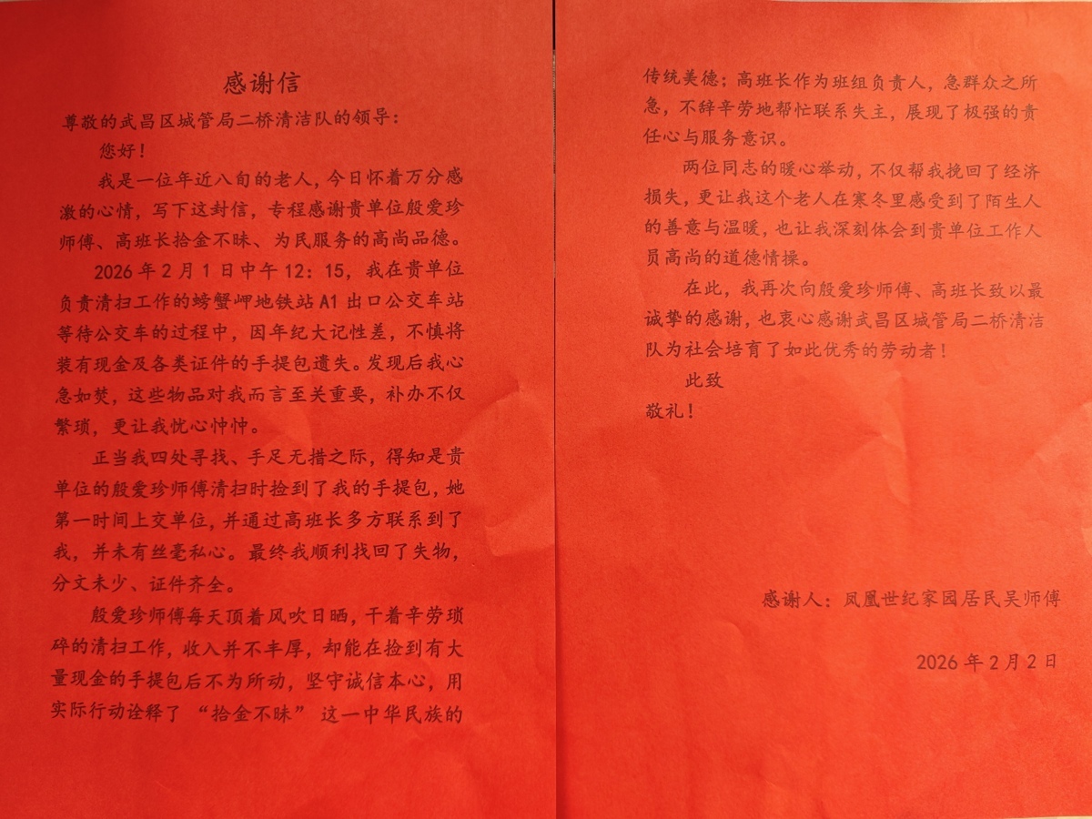 回到家后,吴爹爹一直念念不忘。2月2日,他特地写了一封感谢信并制作了一面锦旗,送到武昌城管二桥清洁队,向拾金不昧的环卫工人殷爱珍表达感激之情。