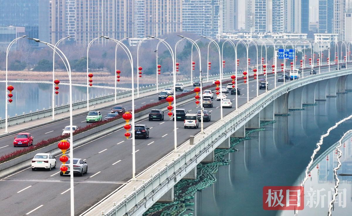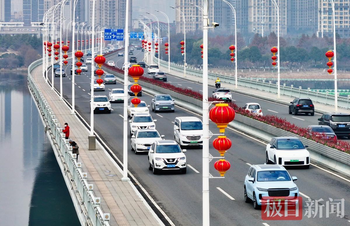 大红灯笼高高挂,透出浓浓年味来。2月4日,武汉市武昌区沙湖大桥、中南路、中北路等主干道悬挂起大红灯笼和中国结,喜庆的红色勾勒出武汉的新春天际线。据悉,春节期间武汉市将有169条道路悬挂灯笼,预计2月10日悬挂完成。今年灯笼展示周期从2月10日持续至3月4日,覆盖小年、除夕、元宵等新春重要节点。
