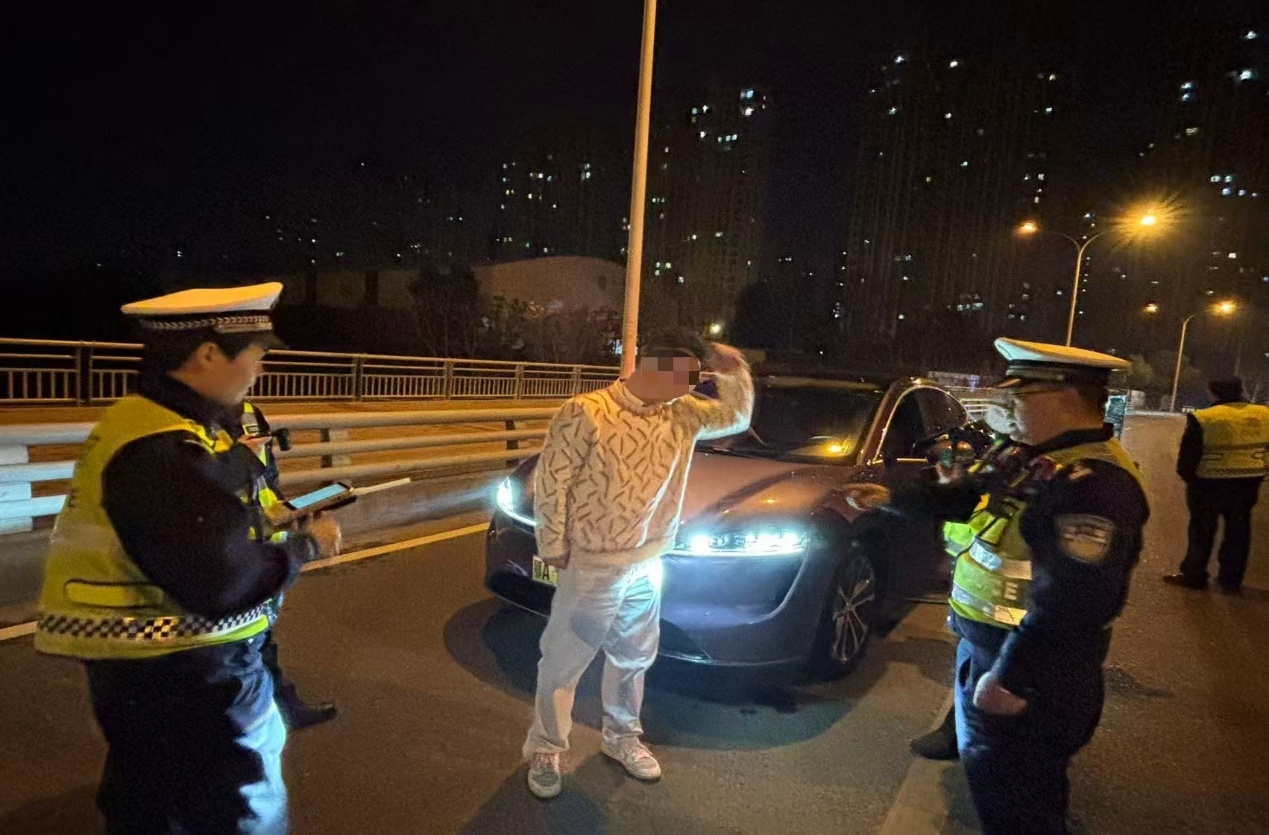 2月14日23时15分,江岸交警马建东、王勇、何成,在建设大道开展检查时发现,一辆SUV的驾驶员有离车逃窜的嫌疑。民警迅速反应,将驾驶员熊某拦截控制。经检测,熊某涉嫌醉酒后驾驶机动车和二次酒驾。