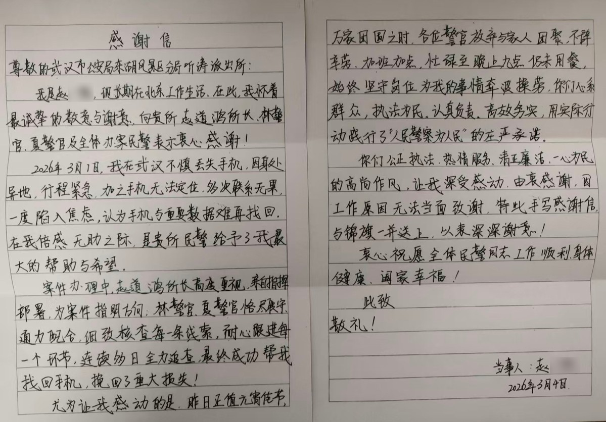 手机完璧归“赵”,让远在北京的赵先生喜出望外。更让他感动的,是武汉民警为了一个承诺而紧追不舍的那股“韧劲”。他当即铺开信纸,一笔一划写下感谢信,又制作了一面锦旗,一并寄往了那个仅停留过数小时的派出所。