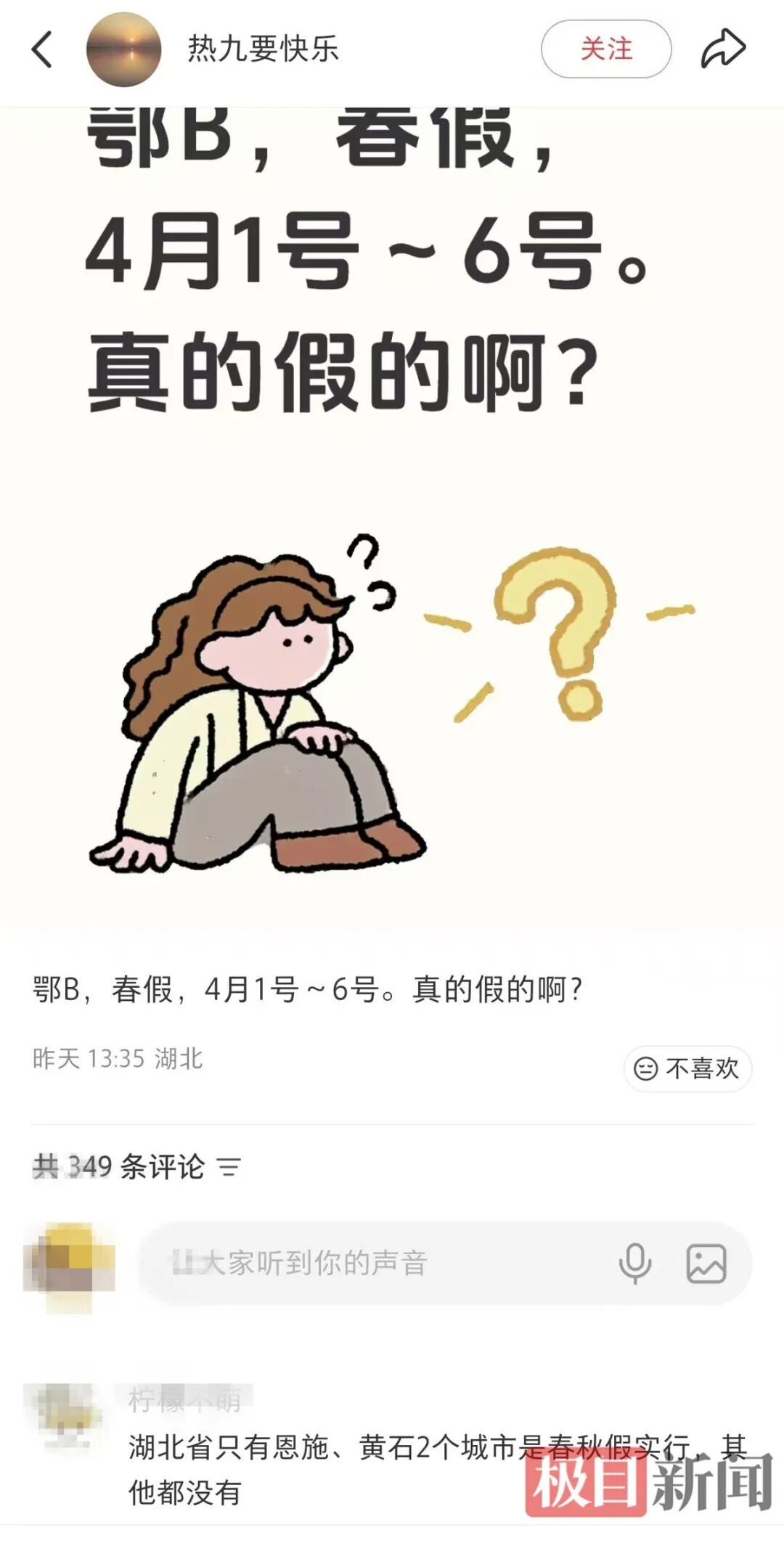 “鄂B,春假,4月1号至6号,真的假的啊?”3月11日,在小红书上一网友发布消息:同事称,黄石全市安排中小学生春假,引来数百条留言。极目新闻记者从黄石市相关部门了解到,目前黄石市仅有黄石港区在3月12日发布消息:2026年中小学春假时间安排为4月2日至3日,共放假两天。与清明节假期衔接形成5天小长假。