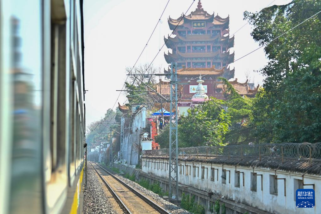 武汉市内普速环线列车经过黄鹤楼。(受访者供图)
