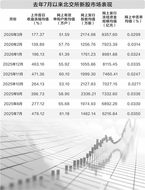 若拉长时间看,2026年以来,北交所新股首日涨幅整体下滑明显。据证券时报记者统计,1月5只新股首日涨幅平均值为196.13%;2月平均值下滑至139.89%;3月以来受族兴新材拉动有所回升,首日涨幅平均值为177.37%。