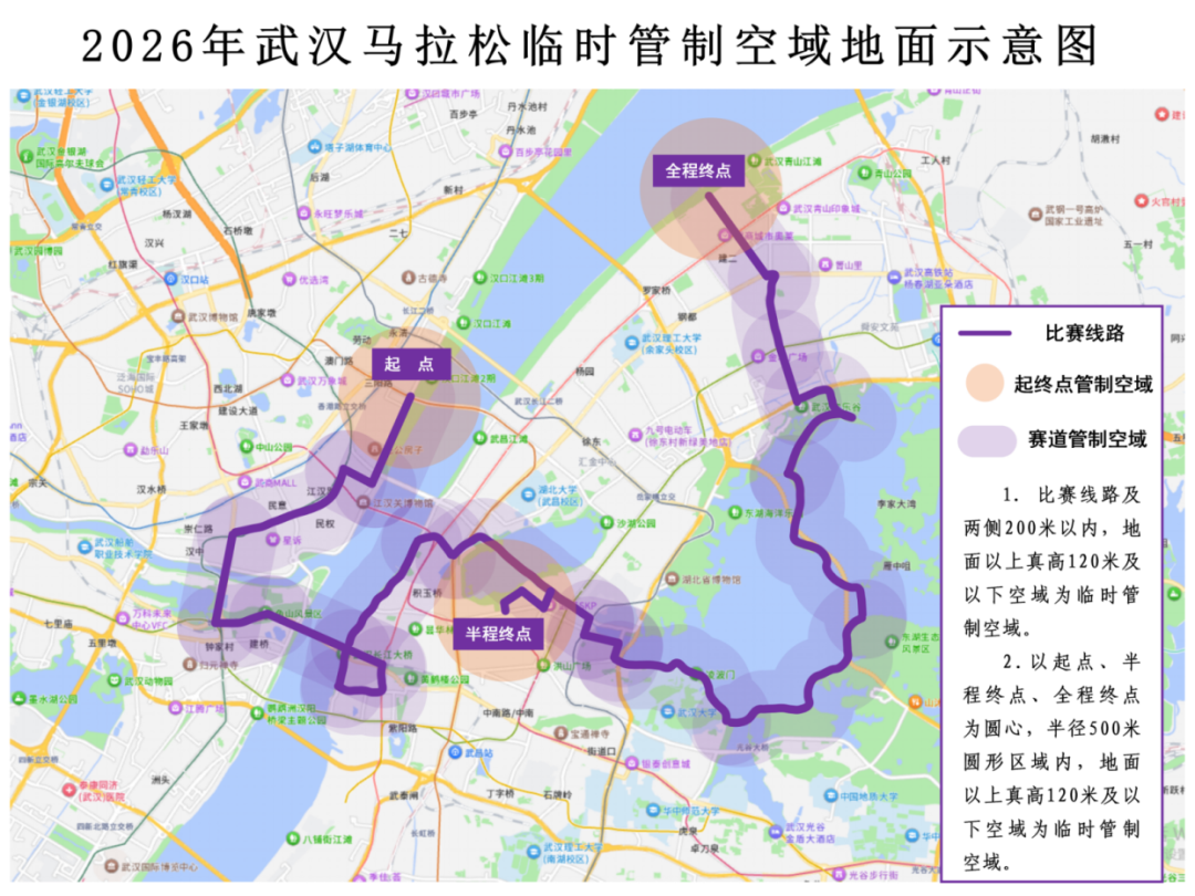 二、临时空域管制区域:马拉松跑道线路及两侧200米以内区域和以起点(沿江大道三阳路路口)、两个终点(书卷路、青山江滩公园)为中心半径500米以内圆形区域真高120米及以下空域(详情见附图)。跑道线路:沿江大道三阳路路口(起点)→沿江大道(右转)→南京路(左转)→中山大道(左转)→武胜路→江汉桥→鹦鹉大道(左转)→龟山南路→武汉长江大桥(右转)→黄鹤楼南路(右转)→彭刘杨路(右转)→临江大道→临江大道下新河路(折返后左转)→新生路(左转)→友谊大道(右转)→沙湖大桥→楚汉路(右转)/书卷路(半程终点)→杏林西路(左转)→白鹭街(右转)→天鹅路(左转)→东湖南路(一棵树左转)→湖山道→东湖东路→湖中道(左转)→鹅咏阳春(左转)→楚云桥→雁归桥→湖中道(湖心岛)→湖中道(东湖港折返)→白马道(左转)→欢乐大道(右转)→武汉欢乐谷(右转)→仁和路(左转)→友谊大道(右转)→建设三路→临江大道青山江滩(终点)。