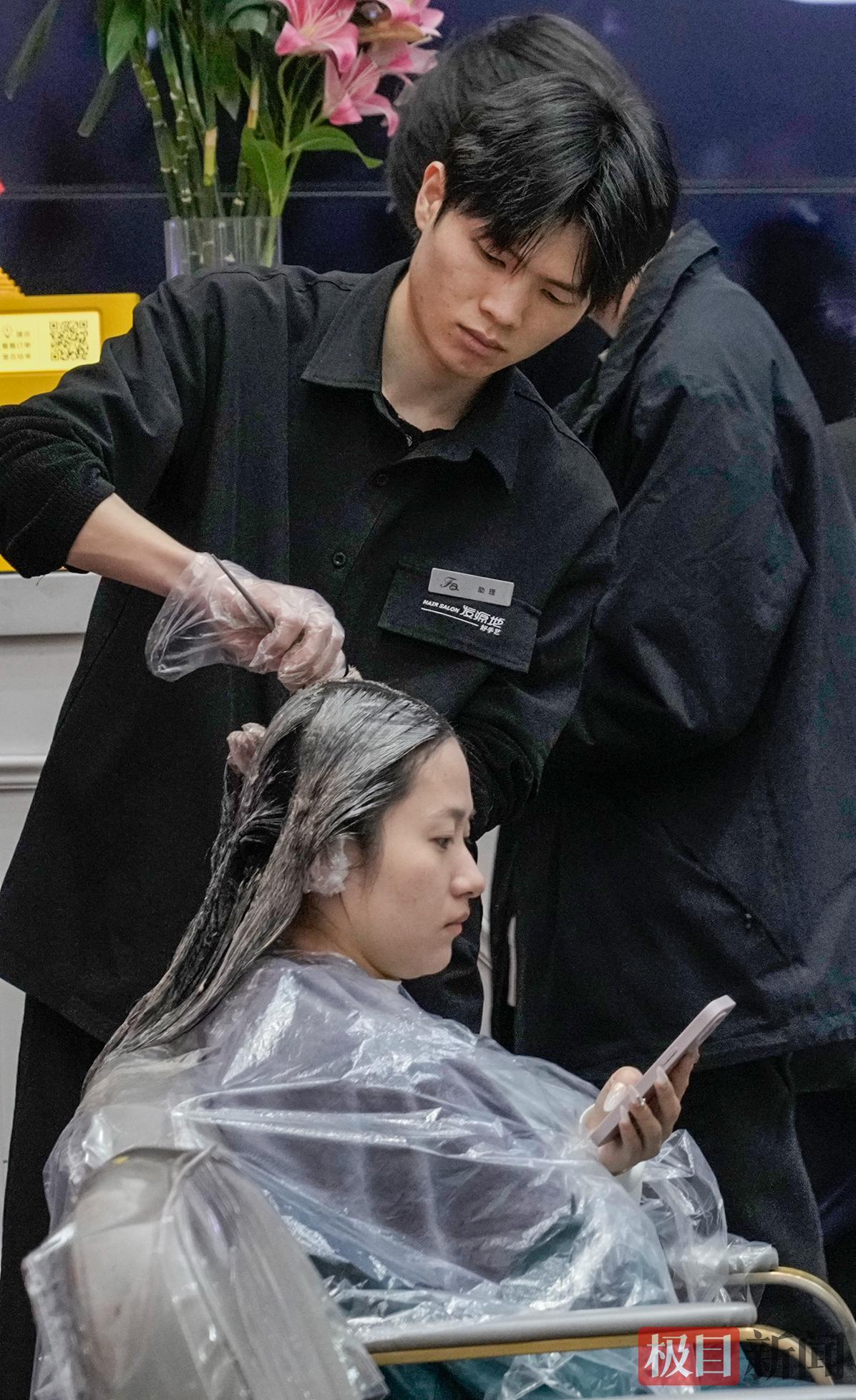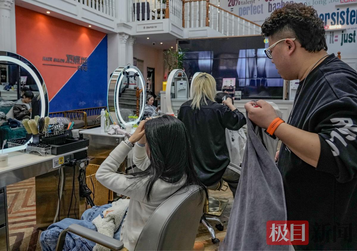 在光谷步行街喷泉广场旁边的一家理发店内,理发师各司其职,洗剪吹一条龙服务不停歇,剪刀声、吹风机声此起彼伏。据门店负责人介绍,“今天是龙抬头,店里客流量比昨天多了许多,不过,由于是工作日,很多人还在上班或上学,明天是周末会更忙。”
