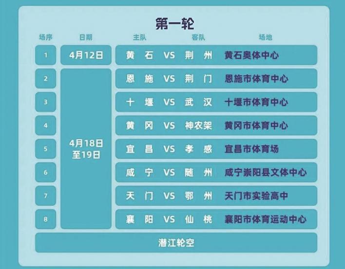 发布的竞赛日程为常规赛阶段赛程表,常规赛预计国庆期间完赛,淘汰赛预计于11月中旬收官。首轮赛程显示,“楚超”的揭幕战将于4月12日在黄石举办,黄石队将在主场对阵荆州队,赛事举办地为黄石奥体中心。首轮的其余比赛在4月18日至19日进行,潜江队轮空,武汉队将客场对阵十堰队,比赛地点在十堰市体育中心。