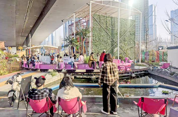 “我们希望在桥下这片特殊的空间里,打造一个充满童趣与温情的活力场。”项目运营方负责人徐海石指着园区门口那棵吸睛的毛绒“烟花树”介绍。除了精心设计、色彩明快的儿童游乐区,项目还配套了休憩座椅、避雨廊架等便民设施。
