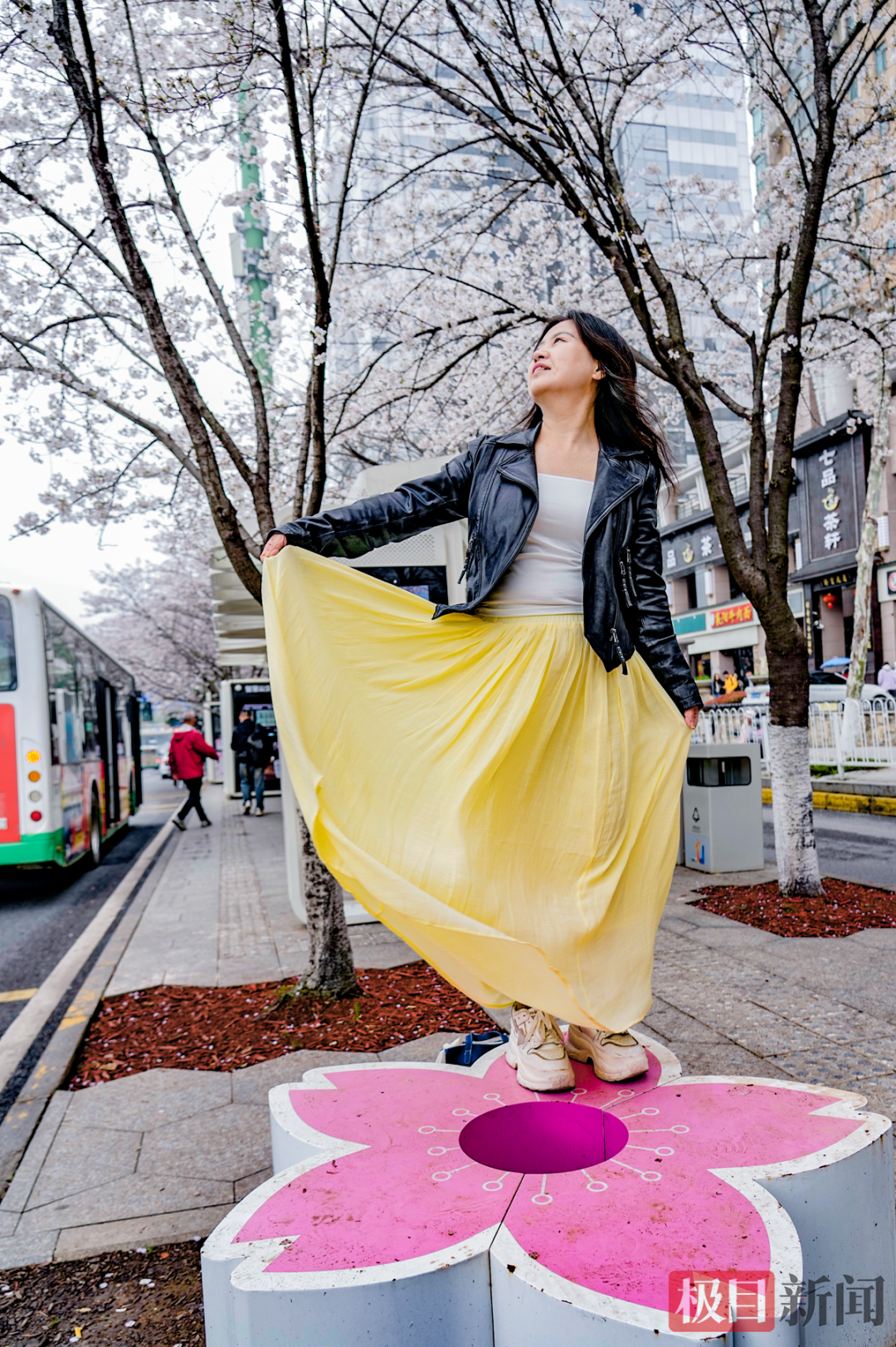 据悉,乘坐25、28、340、513、518、702、703、781路等公交就能到达该站,等车的间隙就能收获一片春色。也有许多游客专程乘车来打卡,欣赏这里的春光。