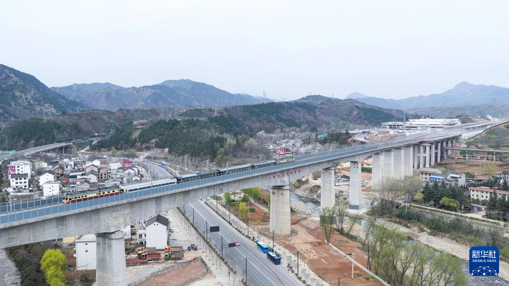 3月29日,检测列车驶过中铁二十局承建的西十高铁南秦河特大桥(无人机照片)。新华社发(郭晨摄)