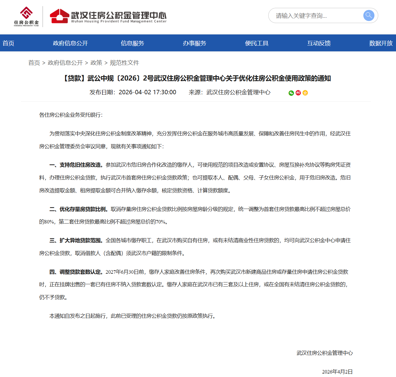 原标题:【贷款】武公中规〔2026〕2号武汉住房公积金管理中心关于优化住房公积金使用政策的通知