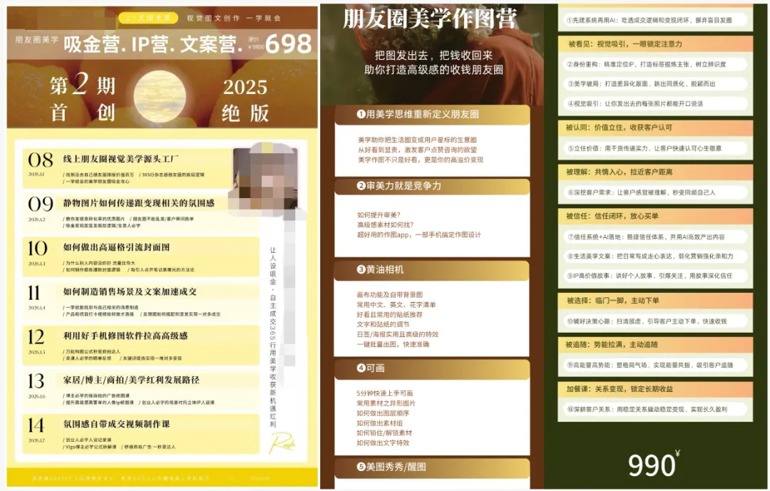 这类培训一般还有更系统、长期的网课,报价从几十块到数千元不等。其中,用美学思维打造朋友圈是当下较为流行的趋势。除了教审美、排版、文案外,这类课程通常还包含使用各种作图工具制作日签、水印、爆单产品图和海报等。