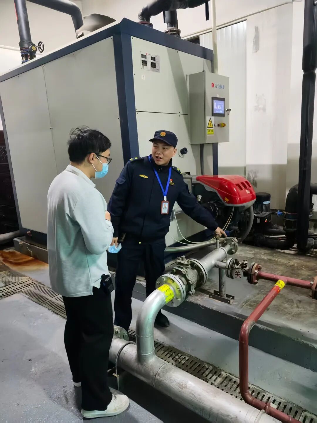 上图:8日,为应对雷暴雨天气,公交安全员王平对508路年轻司机熊志立进行雷暴雨天充电安全的现场培训与指导,通讯员供图