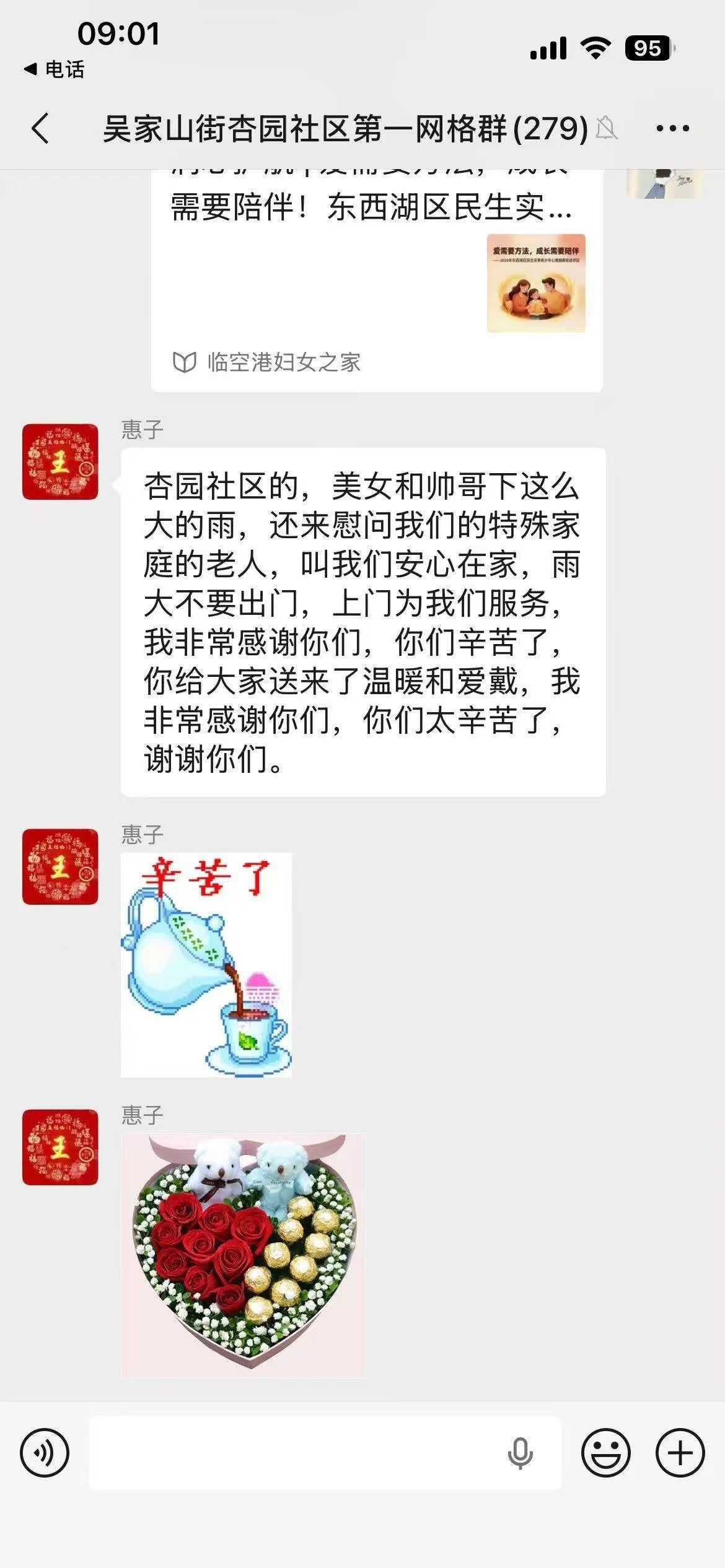 预警信息刚发布,全街15个社区的网格员就化身防汛宣传员,冒雨逐户上门,细致传达最新暴雨预警信息,提醒居民极端天气下的自我防护要点和出行安全注意事项。针对独居老人、困难群众等特殊群体,工作人员一对一上门并贴心叮嘱,确保预警信息不漏一户、不落一人。与此同时,数字AI社区系统和居民微信群同步推送防汛避险知识,线上线下齐发力,暴雨预警实现全覆盖。“感谢社区工作人员下这么大雨,还来慰问我们高龄老人。”4月9日,家住杏园社区的王惠芳在居民网格群里发来一封情真意切的感谢信。