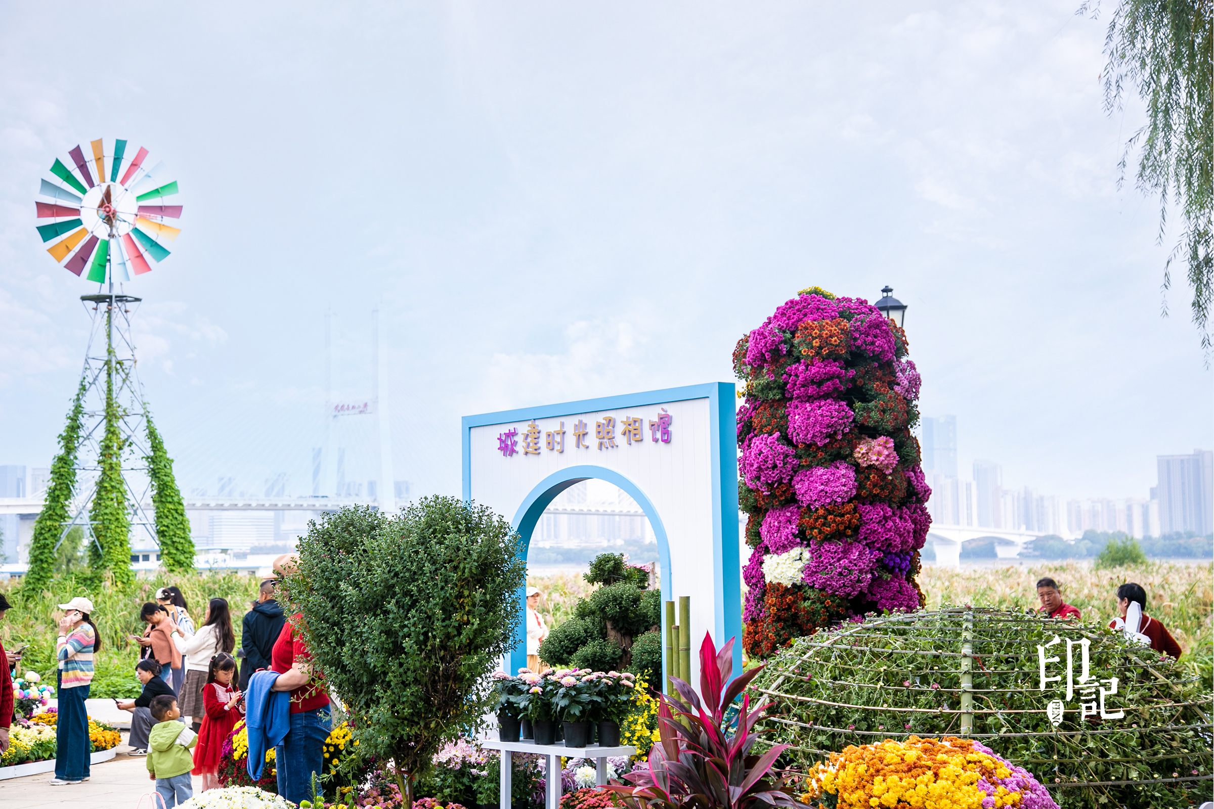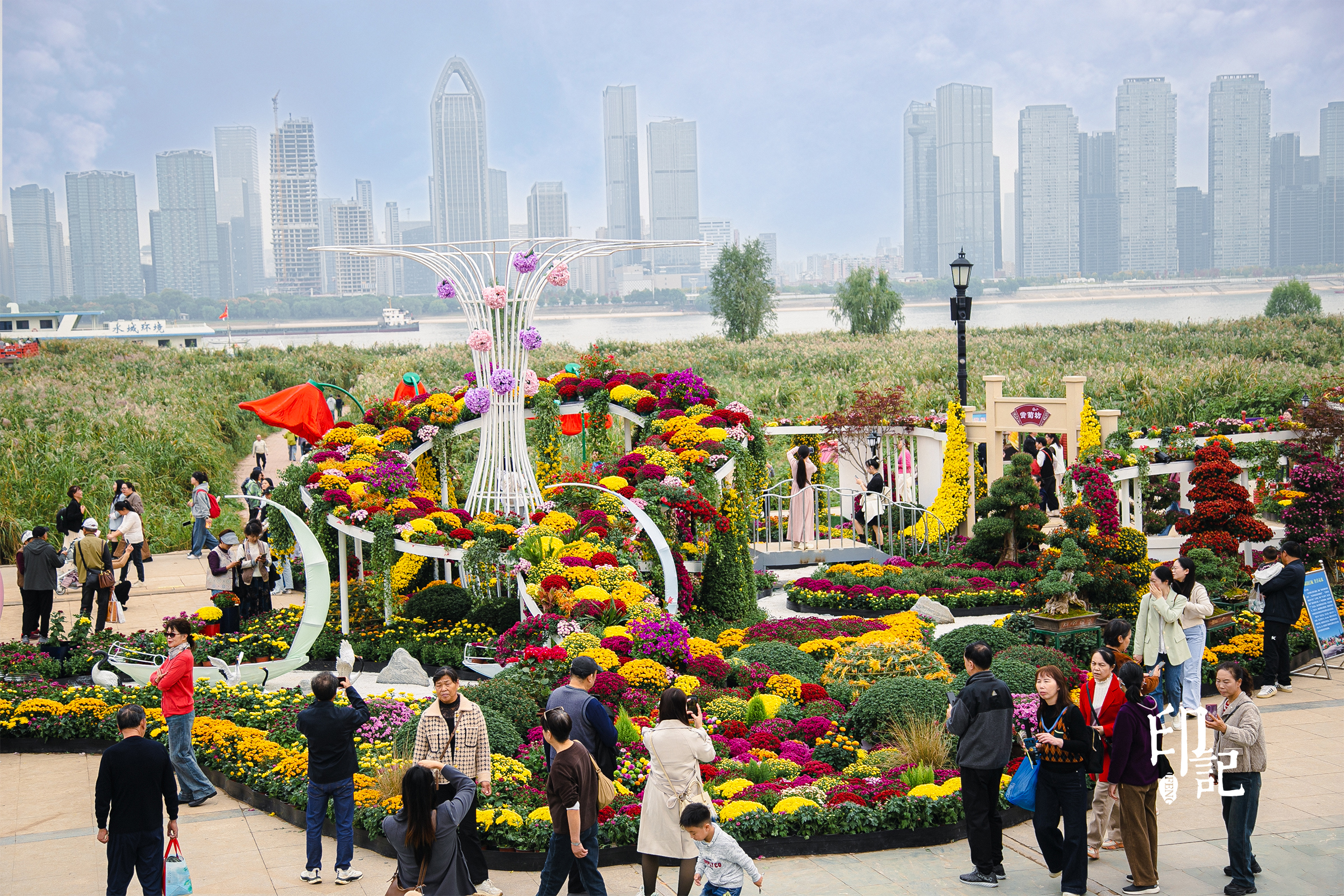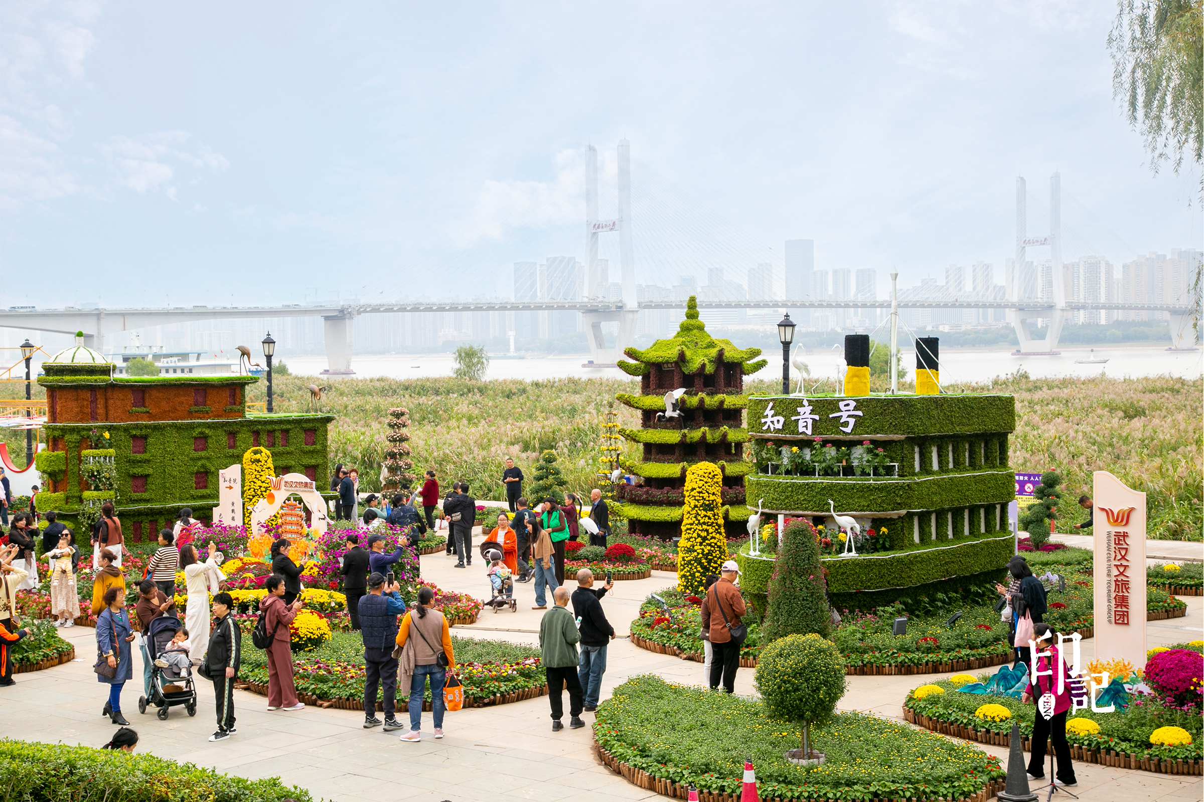 广场上,黄鹤楼飞檐翘角隐现于菊浪之间,知音号船身浮于花海之上,巴公房子的红砖肌理化作橙红菊瓣的拼贴,老武汉的轮廓在花丛中徐徐展开。