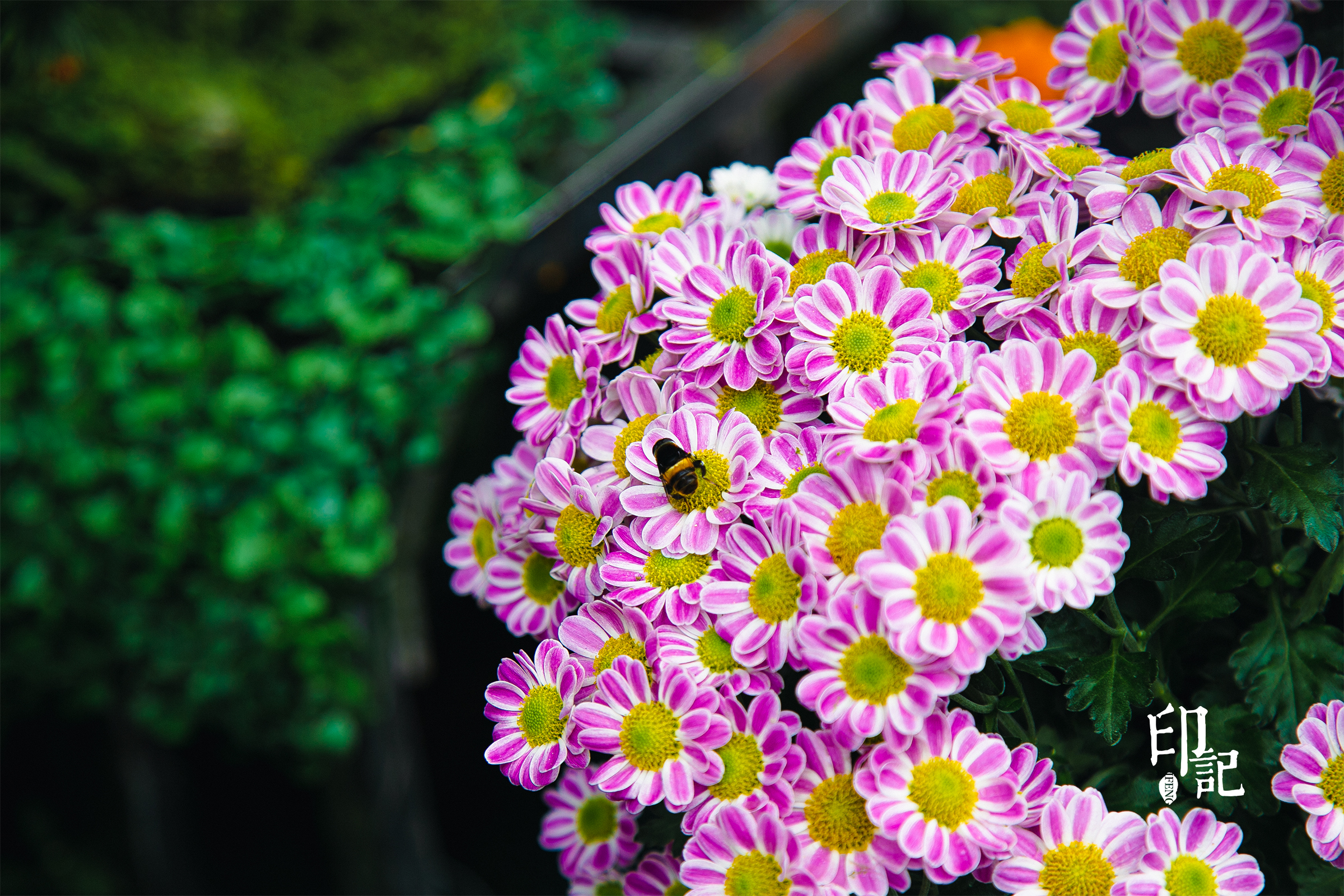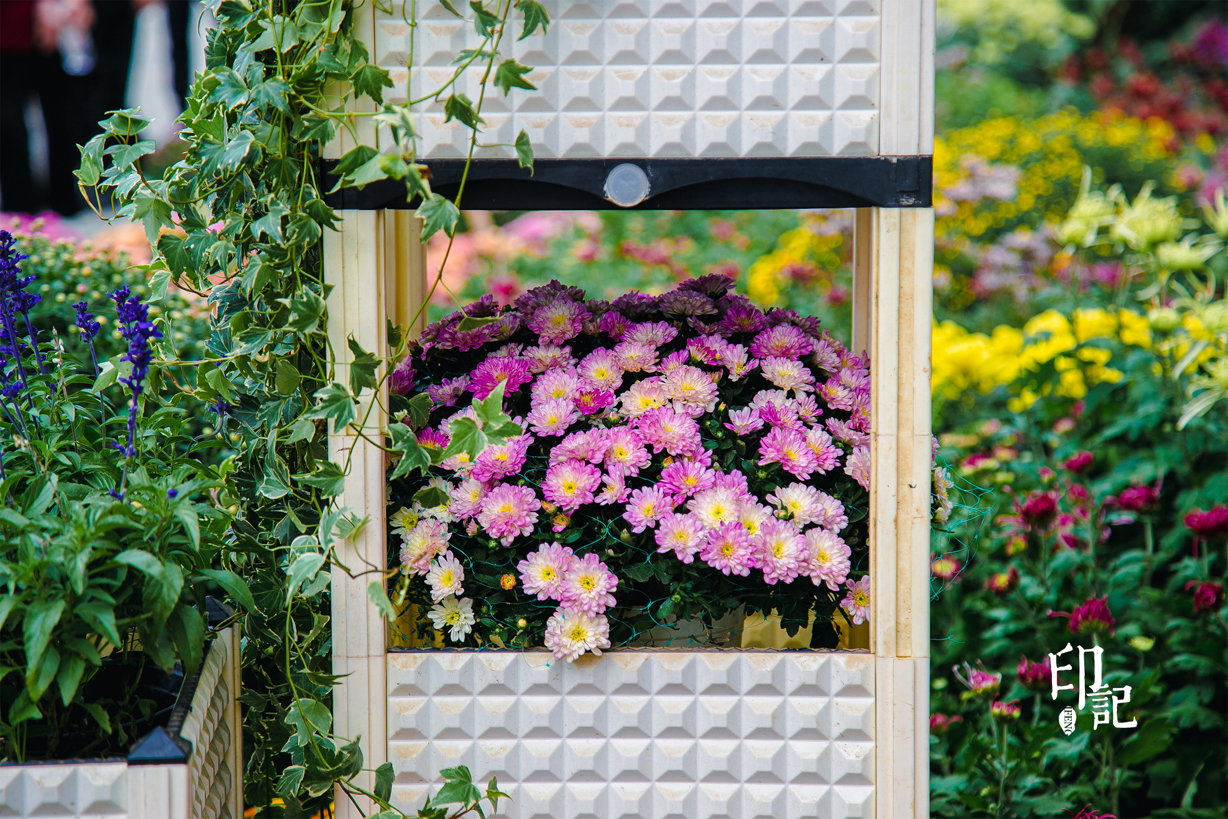 木框如画框,框住紫、粉、白菊的绚烂。木框外,绿藤垂落、繁花簇拥。虚实相生间,绽放蓬勃生机,让这片花海成为秋日里最生动的诗行。