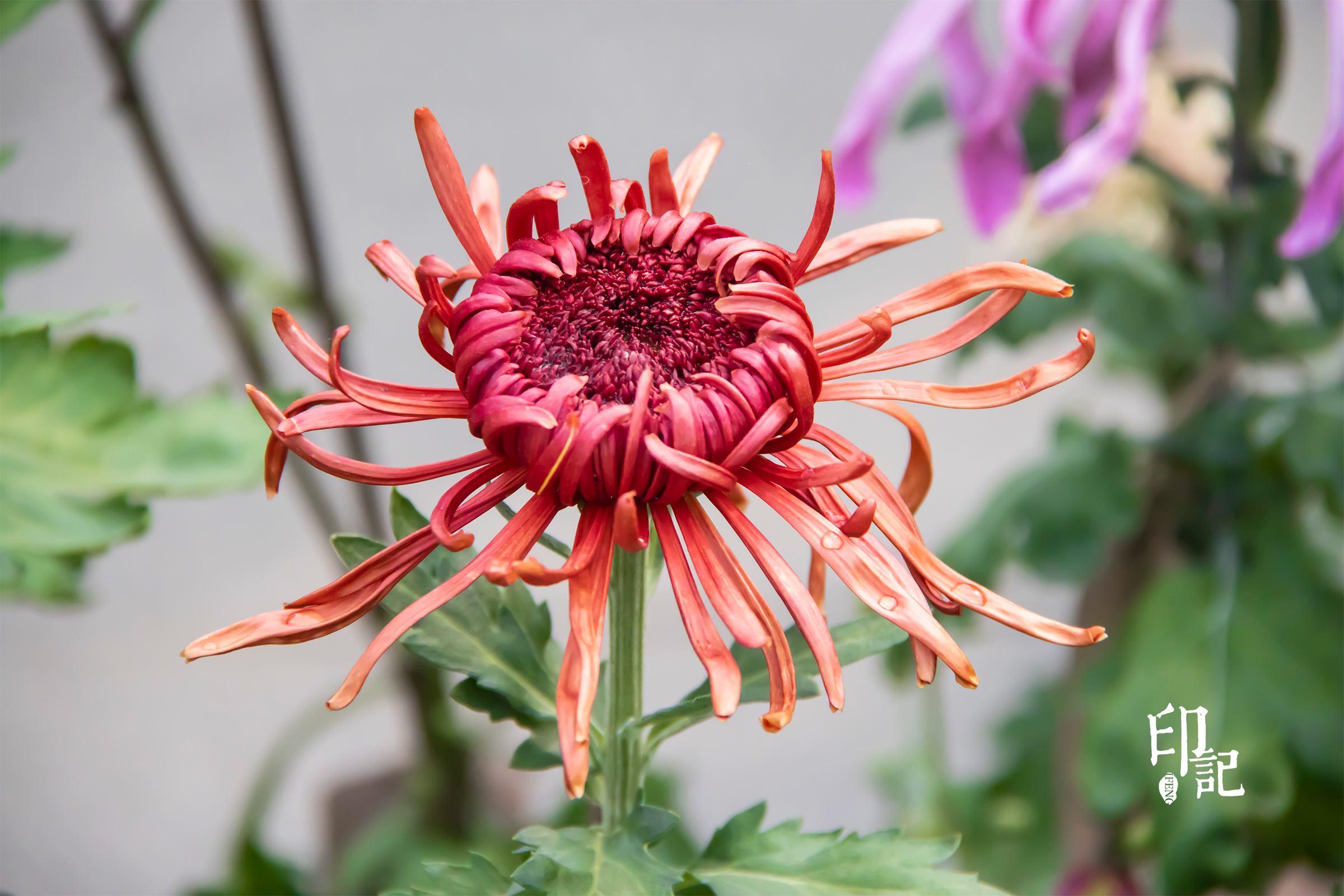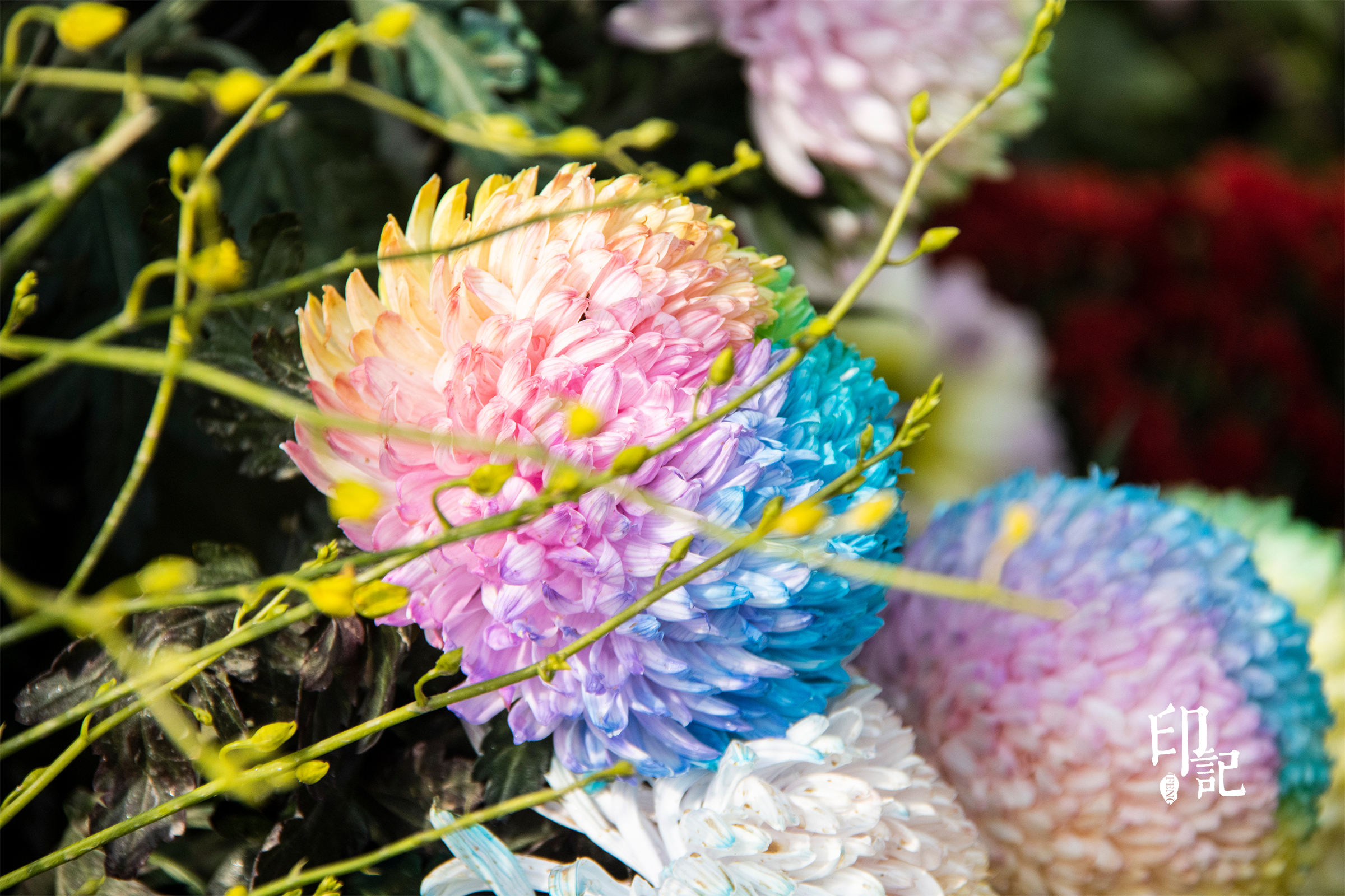 这朵多色菊花,像是被晚霞浸染过的调色盘,又像是彩虹不慎跌落人间留下的碎片,在方寸之间演绎着色彩的协奏。