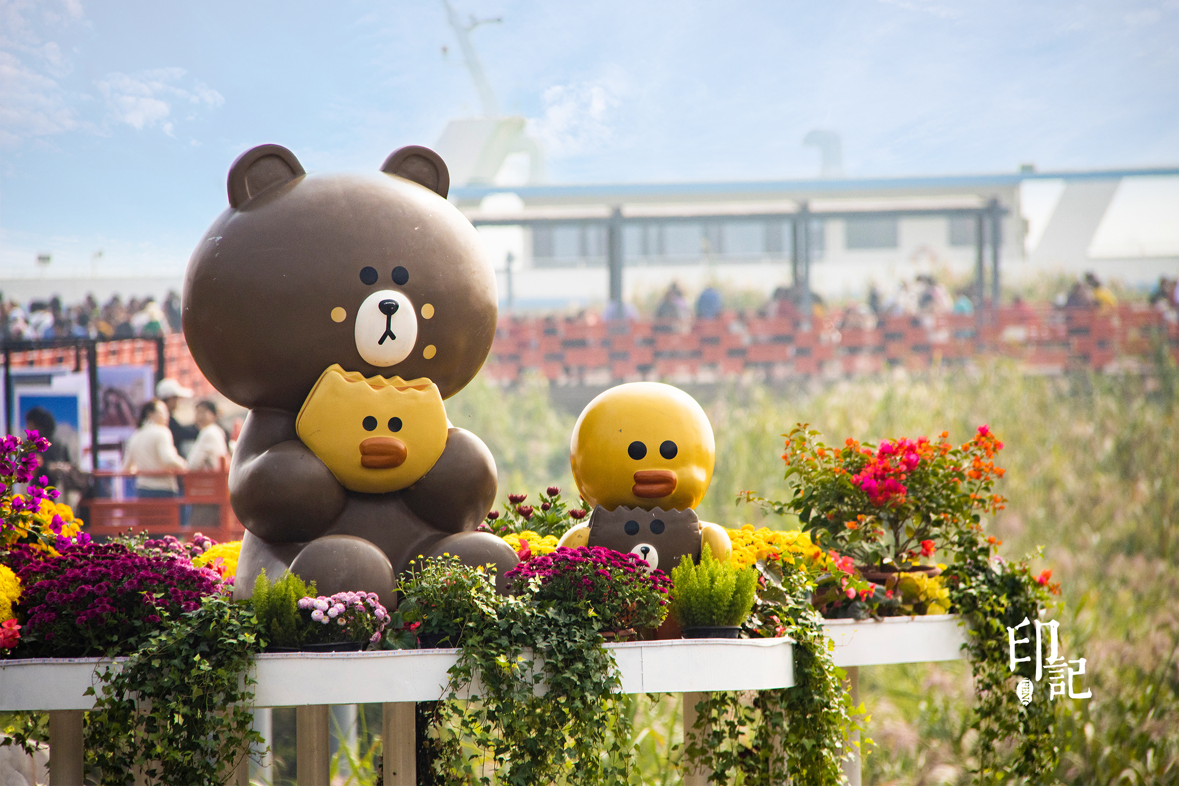 布朗熊静静地坐在金灿灿的菊花丛中,它温柔的棕色恰好融进了秋日的色调,莎莉鸭也从花间好奇地探出头,仿佛它也是这秋日菊园里刚刚绽放的最可爱的一朵。