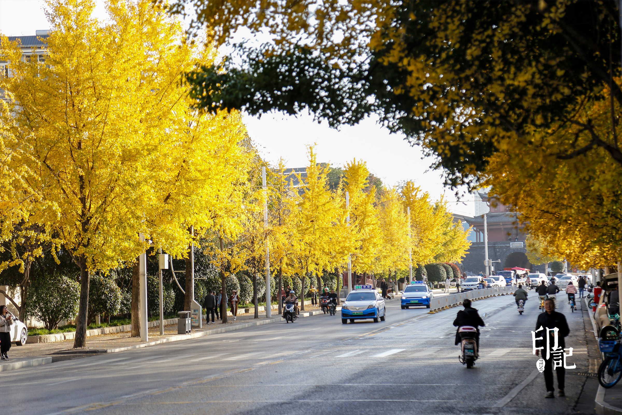 首义路上车辆和行人在“黄金海洋”中穿梭徜徉。