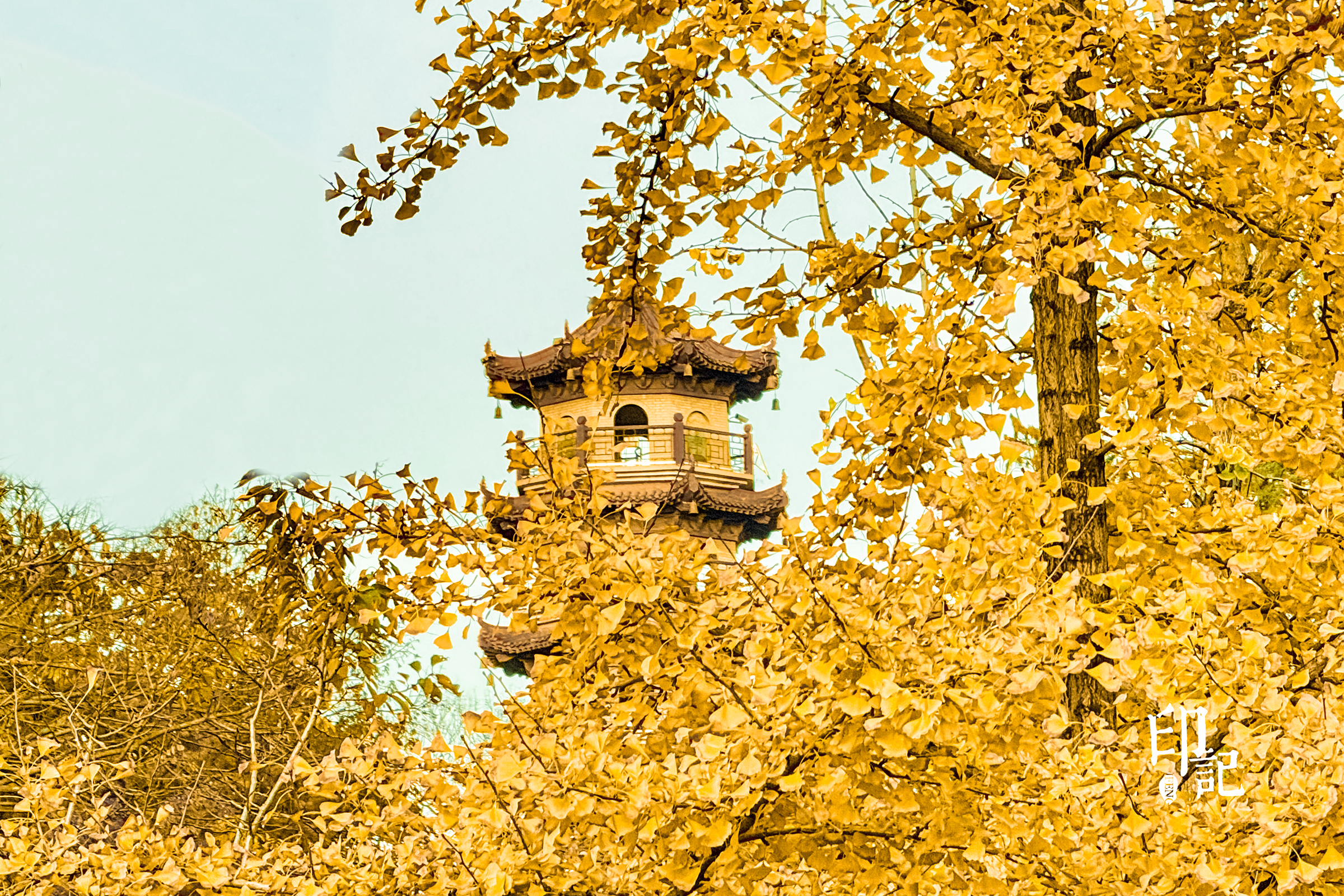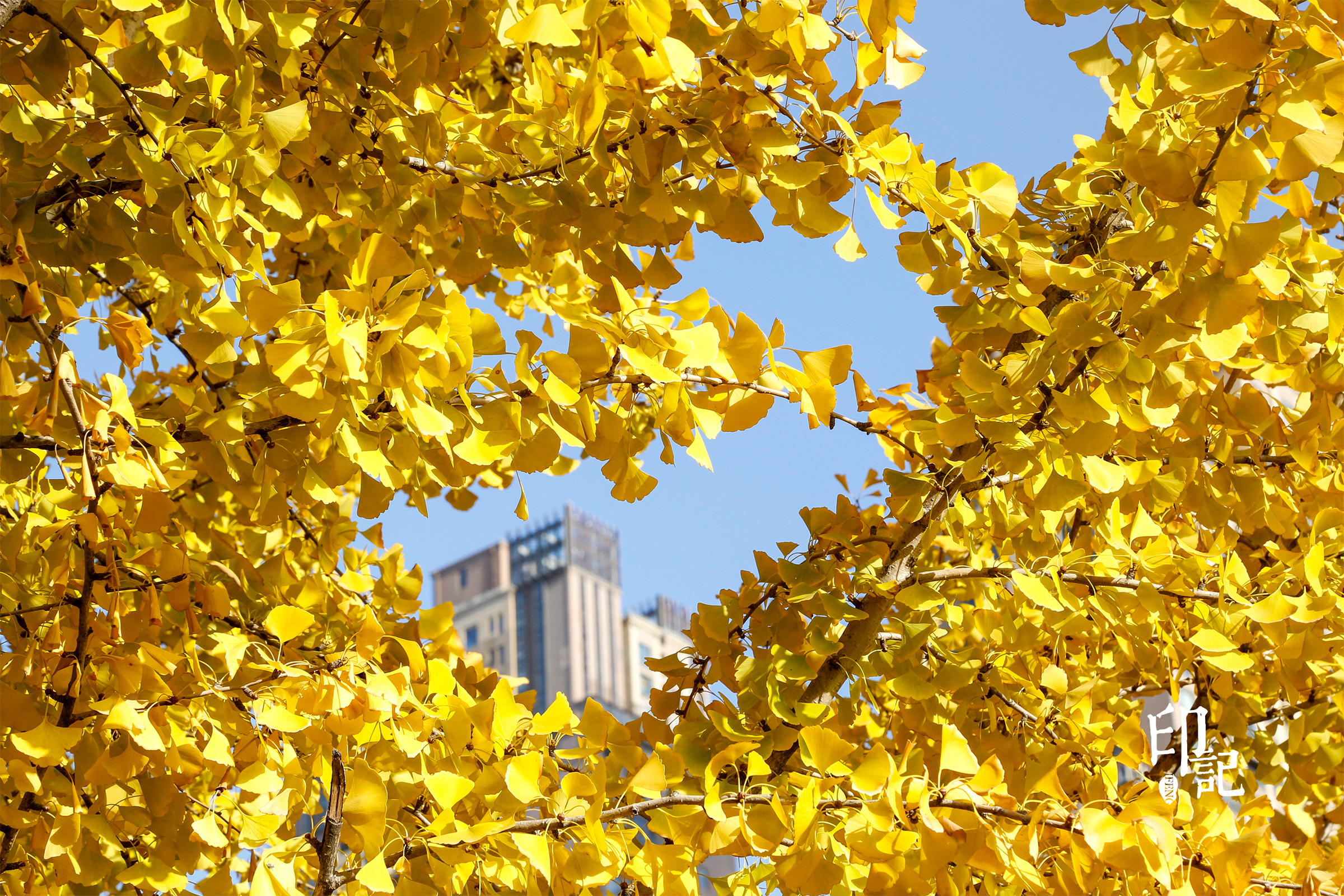 银杏织就金黄穹顶,通过叶隙看到蓝天,秋意裹着晴朗撞进眼底。