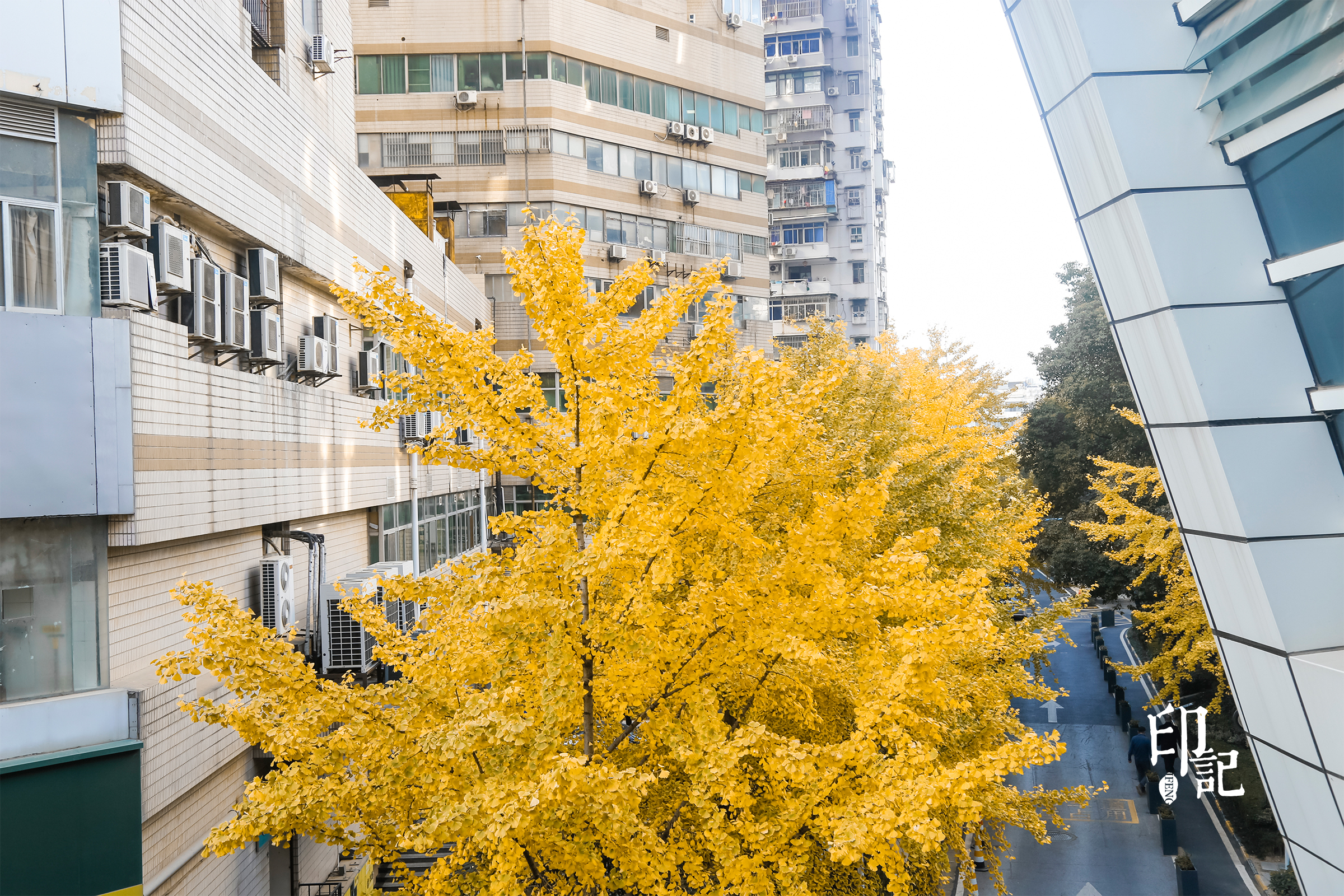 三阳路轻轨站旁,一树银杏在两侧建筑的直线与棱角间,蓬勃成一座金色的泉涌。轻轨列车呼啸而过,一动一静,勾勒出城市生活中并行不悖的两种节奏。