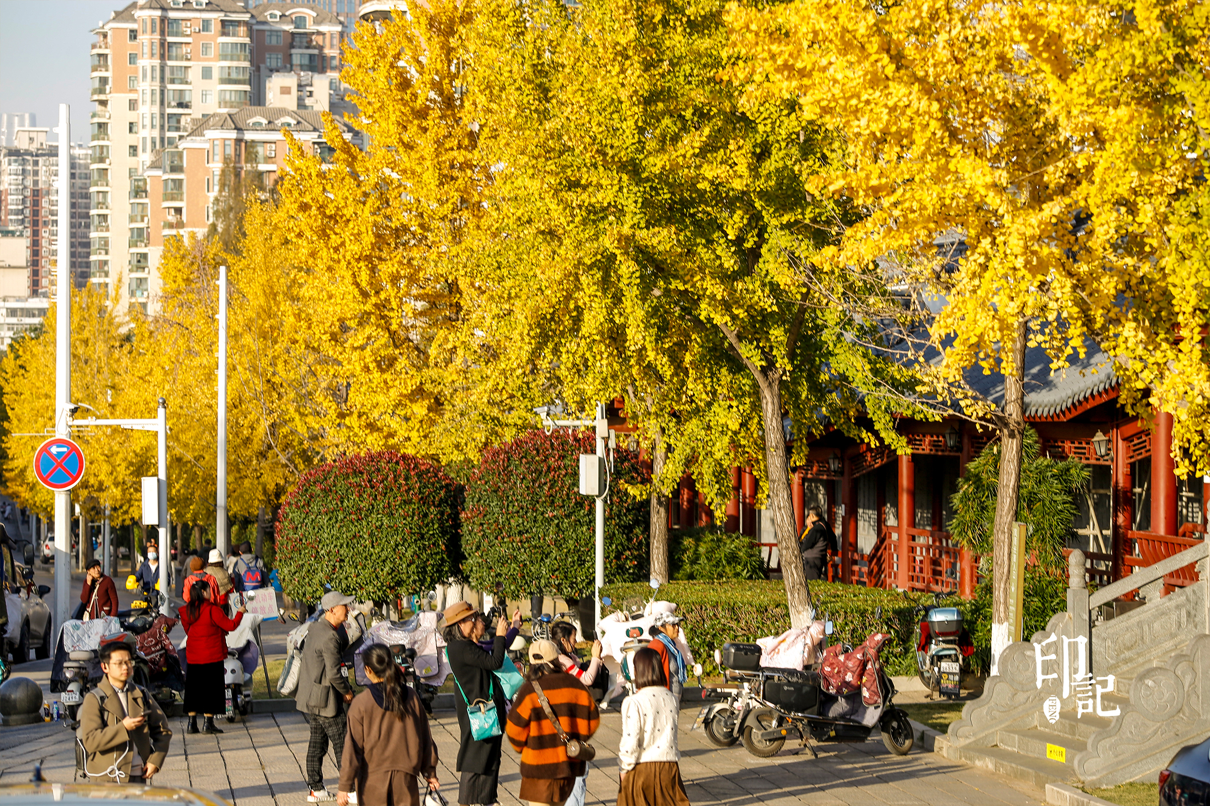 风雨长廊前,亭台楼阁的朱红、银杏叶的金黄加上花坛的绿色,绘就一幅冬日五彩画卷。