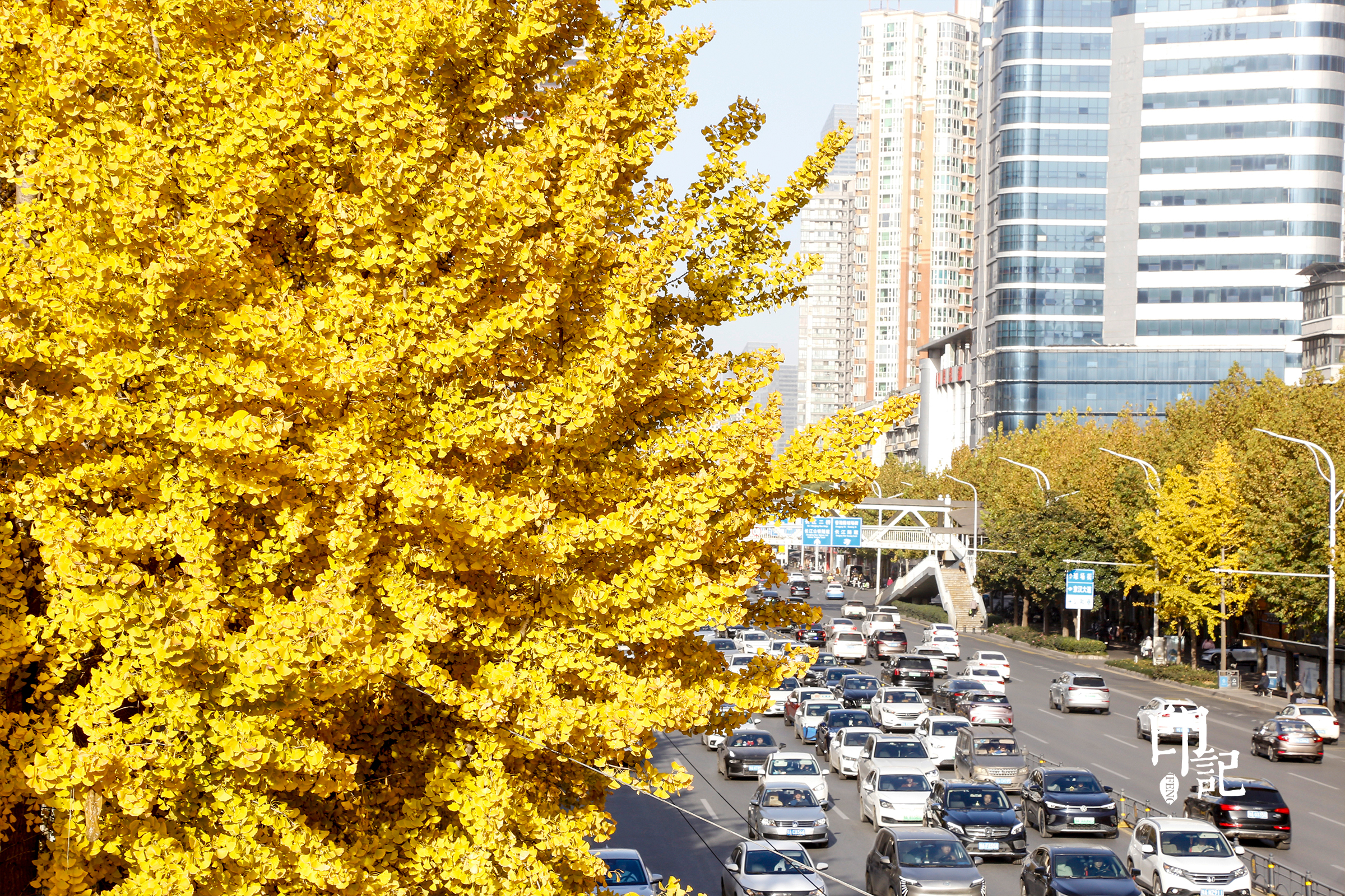 汉口解放大道台北路天桥旁,满树金叶漫过街道,车流在秋光里缓行。都市的喧嚣,都浸在这暖黄的诗意里。