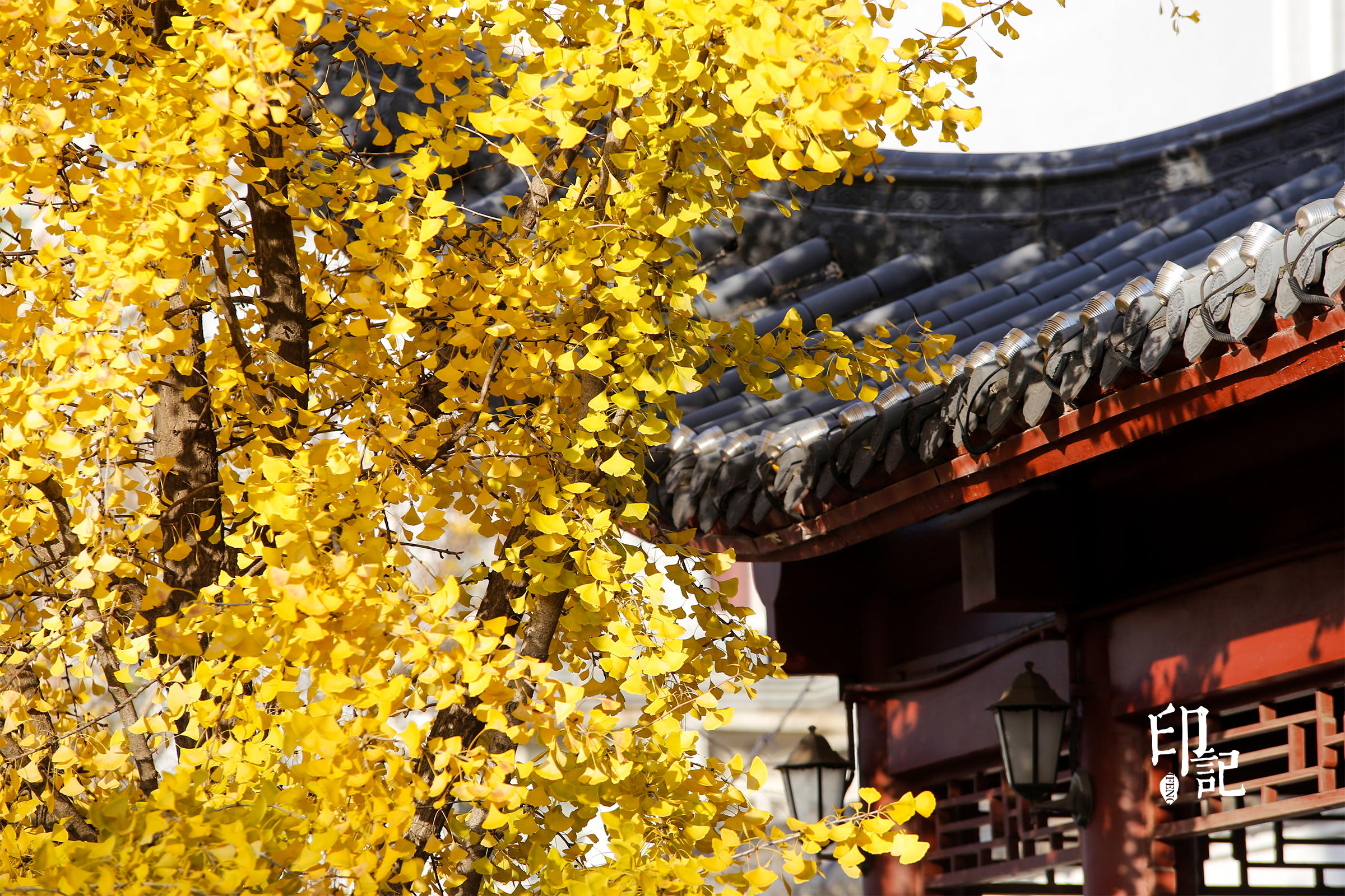 银杏金黄的扇形叶片像揉碎的星光,坠在古建的檐角旁。这是属于老城的秋日私语,连风掠过的痕迹都裹着暖意。