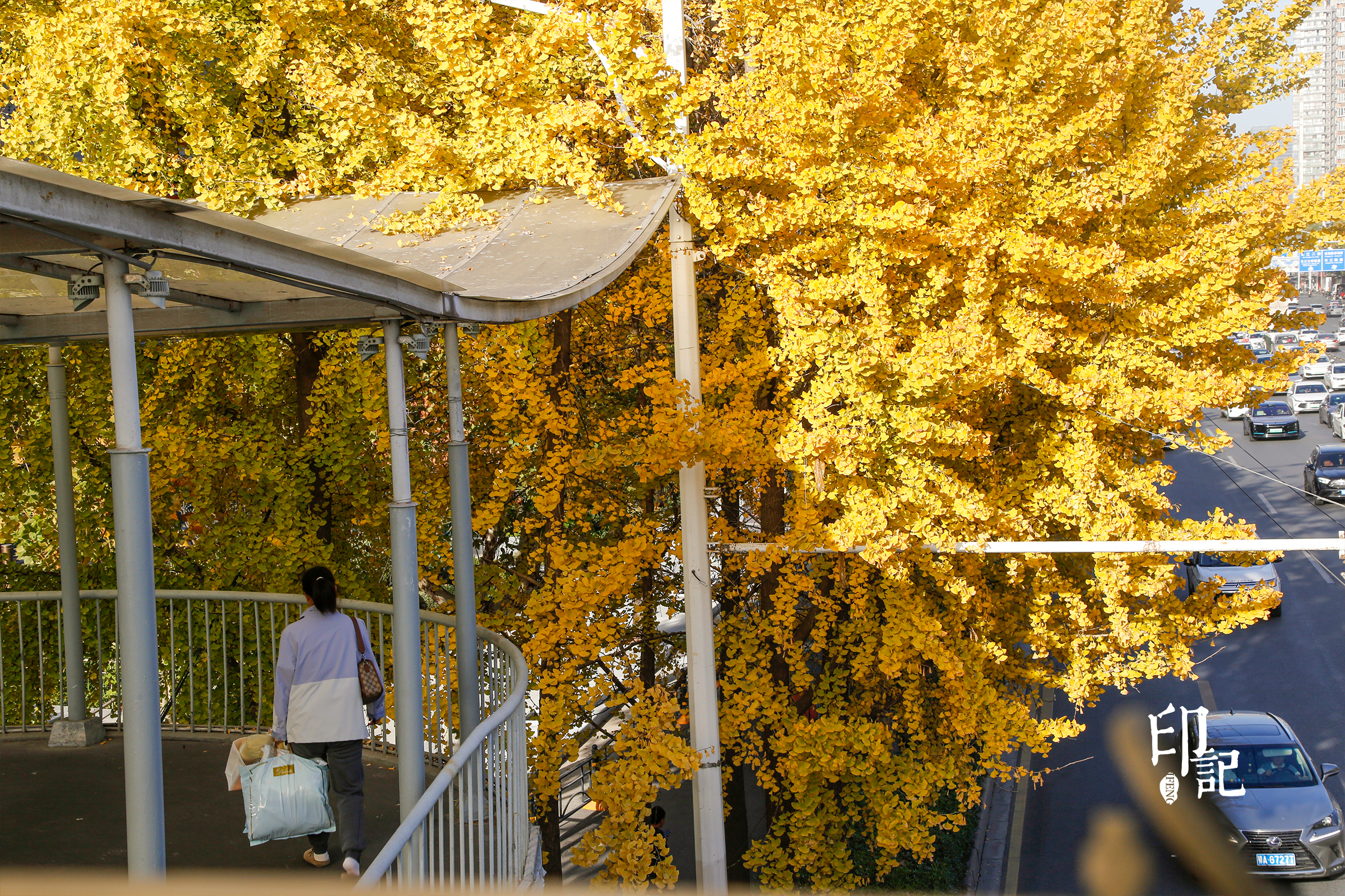 天桥上,银杏裹着暖光。行人步履轻缓,秋意顺着枝桠,落在生活的烟火里。