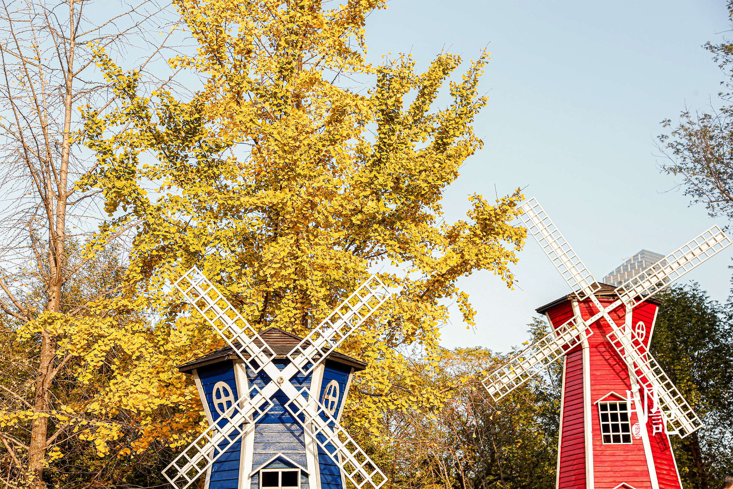 浓郁的色彩碰撞,勾勒出童话般的景致。热烈的银杏与静默的风车,一个倾诉自然之诗,一个描绘异域想象,共同编织了解放公园里独特而浪漫的风景。